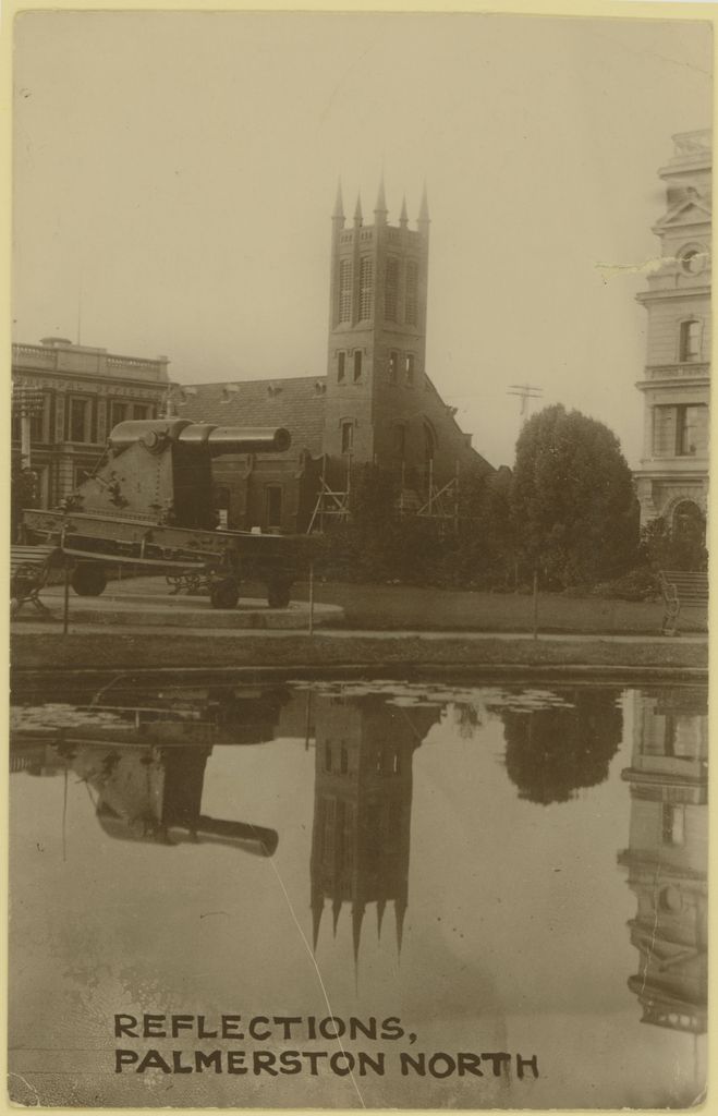 Titled 'Reflections, Palmerston North', this postcard looks across the lakelet to the newly erected All Saints Church, which was built in 1914-1915. The pond was constructed in October 1909. It was the main feature of the last quadrant of The Square to be developed by the then Beautifying Society. The Lakelet is shaped as a butterfly, with the wings being bisected by a bridge as its body. It is also referred to as the Butterfly Lake. The Grand Hotel, on the left side of the photograph, was built in 1906. The cannon at centre was one of two installed in The Square in 1909. The guns were originally purchased by the Government in 1879 and installed at Fort Ngahauranga overlooking Port Nicholson, Wellington Harbour. They never fired a shot and were obsolete by 1900, when two were acquired by the Palmerston North Borough Council for display in the Square. By 1939, the Council decided the cannons had outlived their usefulness and sold them to a scrap dealer.