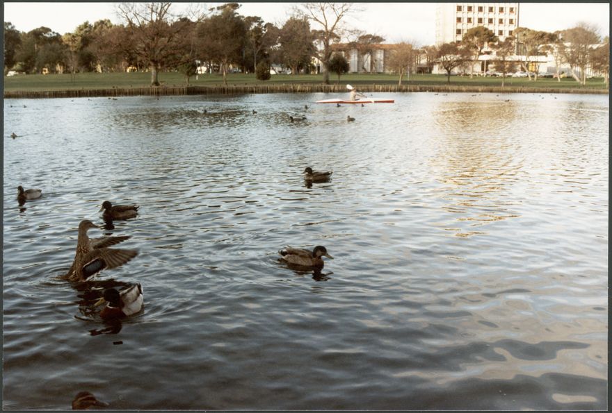 The Hokowhitu Lagoon is one of the original ox bow lagoons formed from the Manawatū River. It is sometimes called the Centennial Lagoon, named for New Zealand's 'centennial' celebrations in 1940. Across the river can be seen the then Palmerston North Teacher's College campus.
