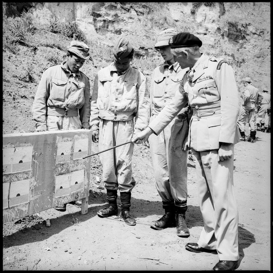 This image was taken for a story that ran in The Manawatu Evening Standard on 23 January, 1964. ""Good shooting, boys," could well be what Lieut.-Colonel W. C. T. Foley, R.N.Z.A.C., Director of Army Cadets, told these school cadets after a practice shoot with Bren guns at the Linton Camp yesterday. The cadets are from secondary schools in the Central Military District's area. Some will return home today and tomorrow. They have spent 10 days in camp. The boys with Colonel Foley are from the left: June Apanuie, from Te Aroroa, Tarzen Takarua, from Tiki Tiki, and Stephen Avery, of Wellington." See also: 2017N_2017-20_018350