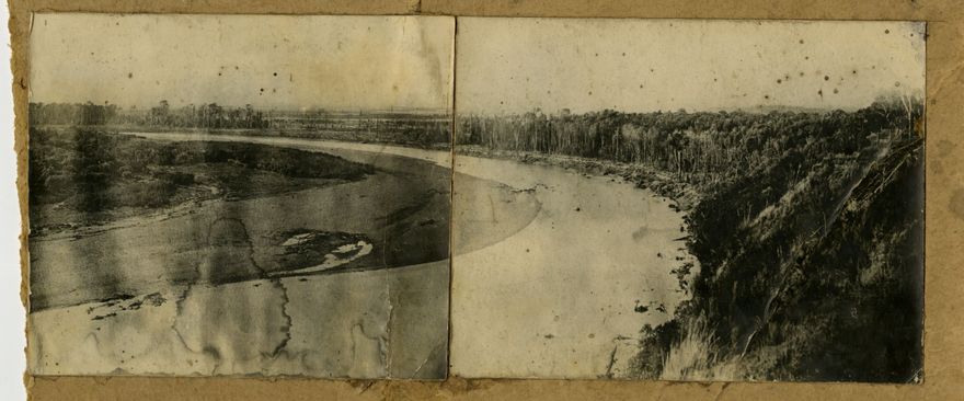 This panorama is thought to be an early view of the first "Bulls Bridge" spanning the Rangitikei River.