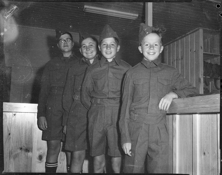 This image was taken for a story that ran in The Manawatu Evening Standard on 4 February, 1959. "The great attraction inside the Quartermaster's store was these Palmerston North Boys' High School boys as they tried on their new uniforms for size. They are from left to right: J. Cameron, R. Barnes, T. Andersen and R. Adams." Another photo associated with this article appears on the same day.