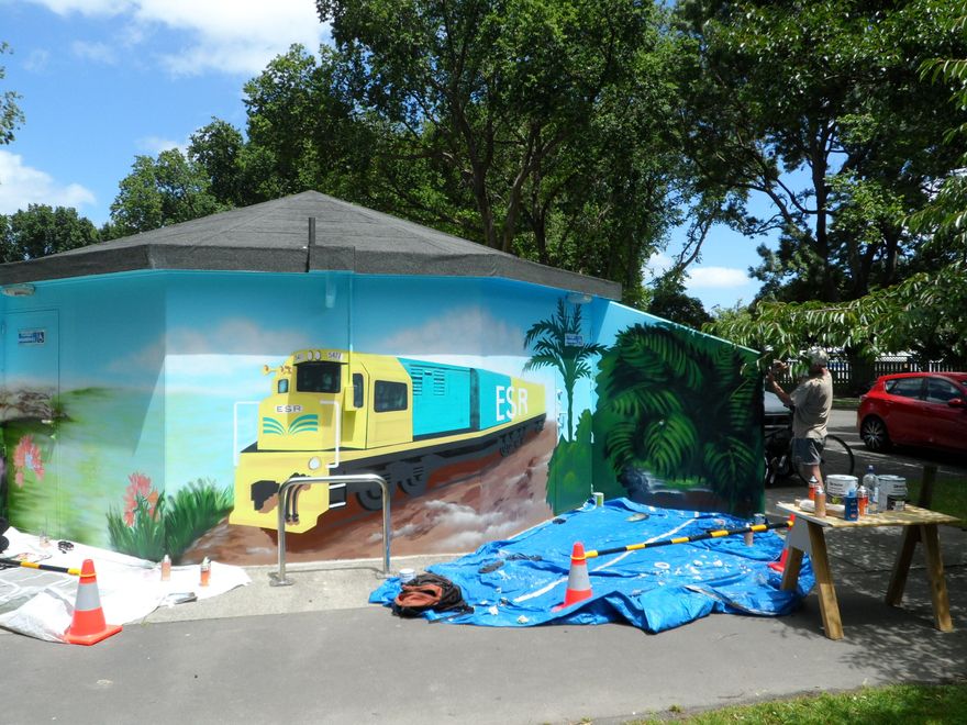 This block of toilets was built in the 1990s and is situated by the Scenic Railway platform in the Victoria Esplanade. The new paint job took three weeks and was completed at the end of December 2016. Local artist Gemma Farrel designed and painted the murals, which feature tuis, ducks and the Victoria Esplanade Miniature Train. This project is a Placemaking initiative.