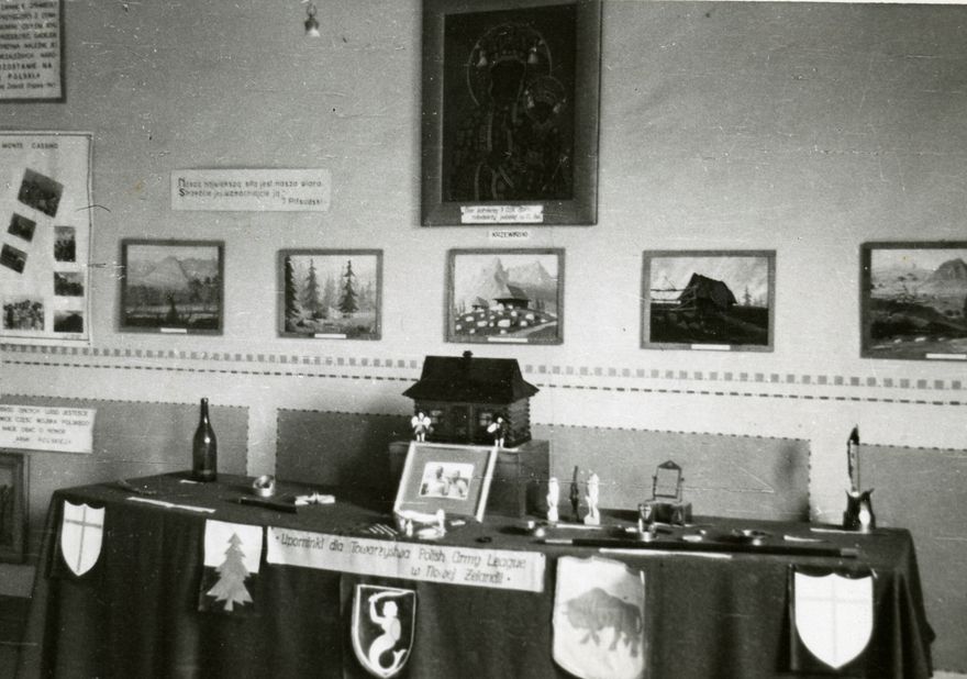 Exhibition of gifts to be sent to New Zealand, as displayed at Cupra Marittima, italy, during World War Two. The gifts were made by Polish soldiers to give to New Zealand as an expression of their heartfelt gratitude for New Zealand's treatment of the Polish children refugees and appreciation of the great friendship shown to the soldiers through the sending of correspondence and parcels, during World War Two.