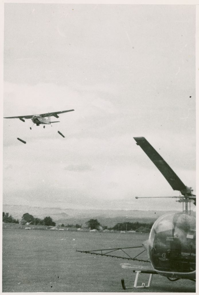 Possibly a Bell model 47 helicopter. The first International Agricutural Aviation Show was held at Milson Airport, Palmerston North, 9 - 10th November, 1956. Over 60 aircraft attended and a crowd of 2000 were entertained with a fly-pass of 64 planes.