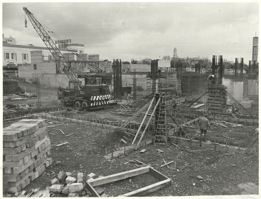 The building of the new Palmerston North City Council administration offices on The Square. This view looks over the construction to The Square and the corner of Main Street.