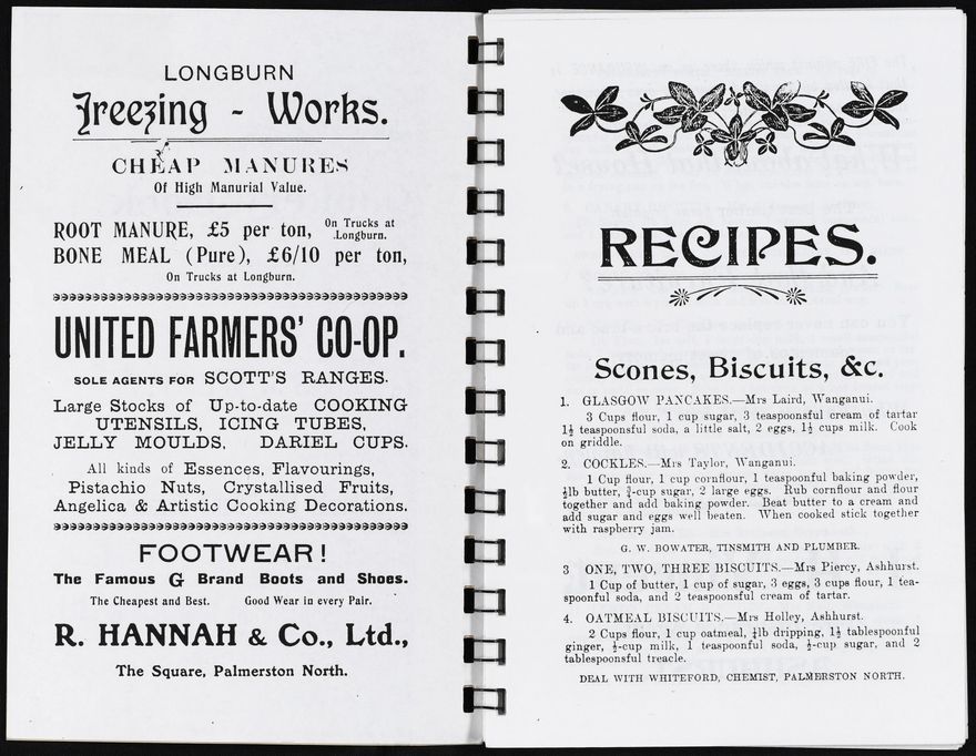 A reproduction of Our Own Cookery Book compiled by Mrs J. West for the Ashhurst Town Band Bazaar. The cook book features community submitted recipes (including the names of contributors) and includes many advertisements of local area businesses.