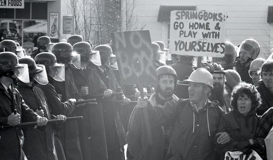 This image was taken (but not used) for a story that ran in The Manawatu Evening Standard on 01 August 1981. The Standard reported that the protesters stood ‘eyeball to eyeball’ with Police in riot gear for 24 minutes during an unplanned standoff on the intersection of David and Cuba Streets.