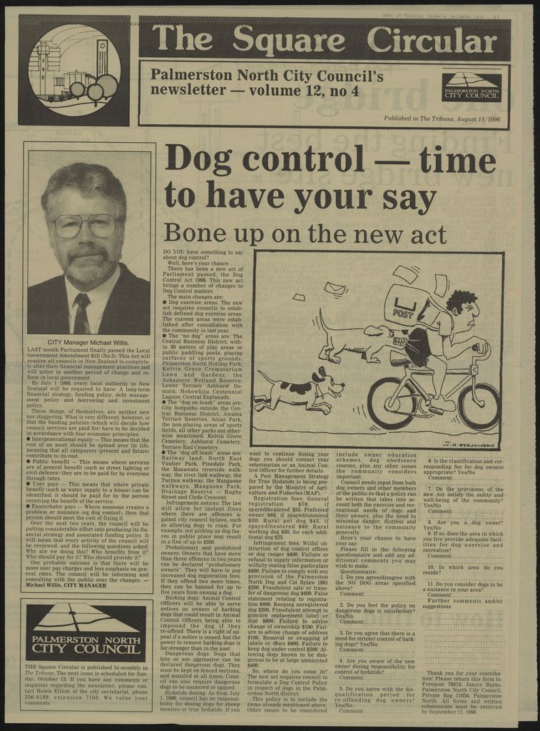 The Square Circular was Palmerston North City Council's monthly community publication, informing Palmerstonians of PNCC initiatives, activites, and events. This month's issue includes: Michael Willis; animal control; second bridge options; Esplanade; Milson Line overbridge ;lagoon; Coleman Place; Ambassador Choir; cycle safety; service guide; Nga Rongonui; Regent theatre; creative communities funding; meetings.