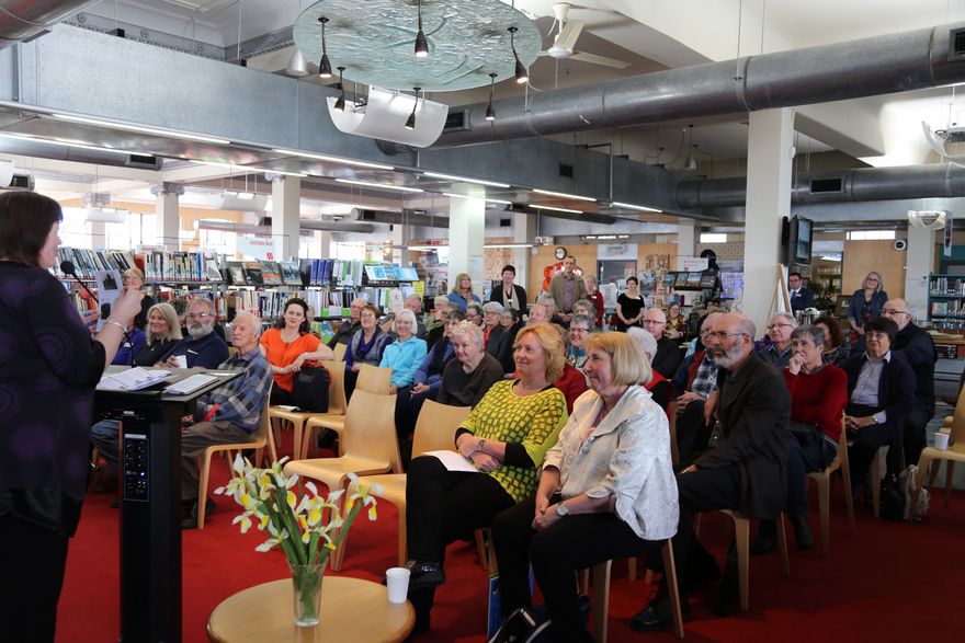 The 9th annual Local History Week was opened at the Palmerston North Central Library. Maria Shiva speaks to the guests. Front row, right: Debbie Duncan, General Manager, Libraries and Community Services; Leonie Hapeta, PNCC Councillor