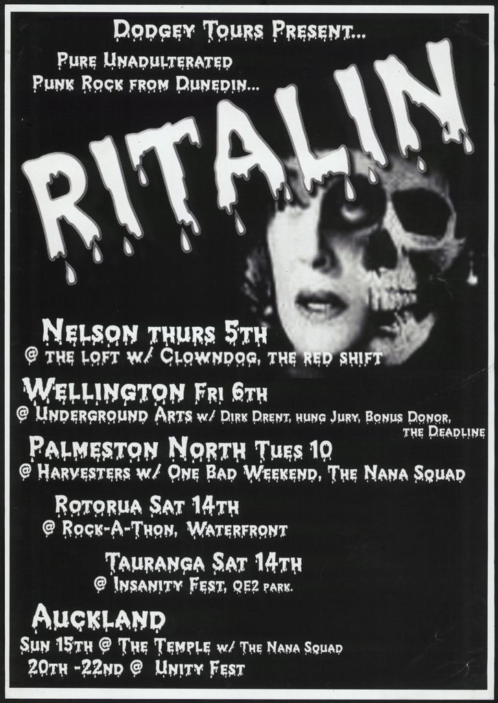 Dodgey Tours present...Pure unadulterated punk rock from Dunedin. Ritalin. Palmerston North Tues 10 @ Harvesters w/One Bad Weekend., The Nana Squad. Part of a collection of posters that were displayed at The Stomach, Lombard Street, venue for Creative Sounds Society Incorporated.