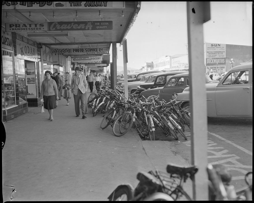 This image was taken for a story that ran in The Manawatu Evening Standard on 25 August 1960 "This photograph taken outside a local theatre yesterday afternoon shows how many of the school children spend their leisure time during the holidays. For some, organised sport is available, but many children have to find their own entertainment."