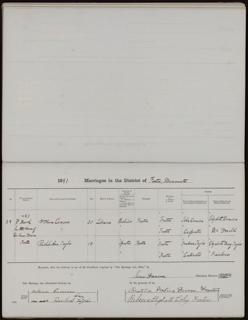 This marriage register was for the Foxton Presbyterian Church from December 1880 to June 1894. The reverend was Reverend James Duncan. It includes registry of marriages outside Foxton and Certificates of Dissolution of Marriages where applicable.