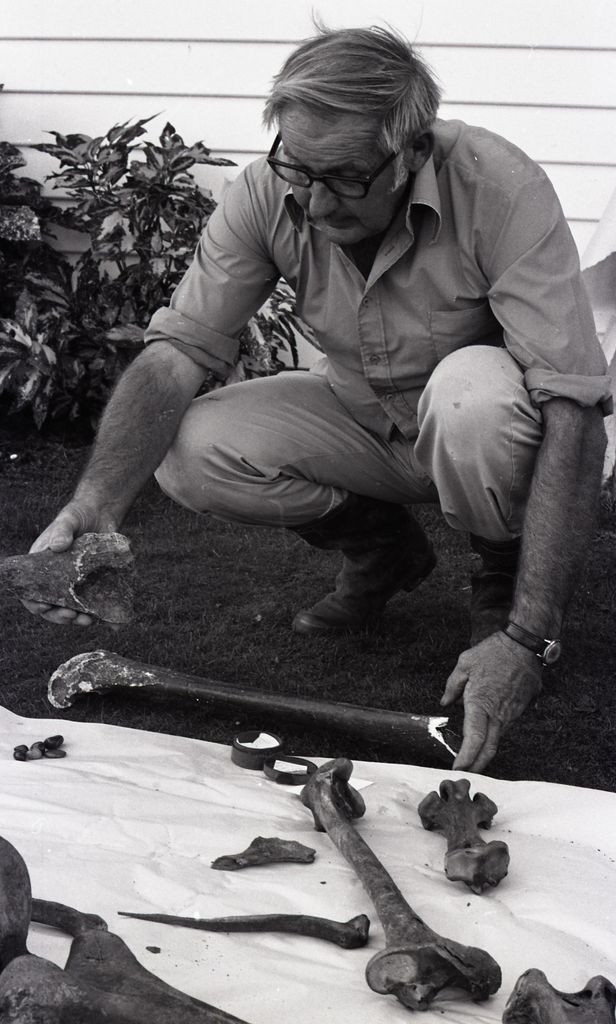 This series of images were taken for a story that ran in The Manawatu Evening Standard on 29 April, 1982. “A well-preserved set of moa bones found on a Levin farm this week will have to be identified by an expert. The bones – a foot and a leg from a large bird and bones from a smaller bird – were found during clearing of a drain 1.5 metres deep on Mr Collis Blake’s farm at Ihakara, north of Levin. R Lou Gurr (left), a former reader in zoology at Massey University, said the large bones definitely came from the “big moa” but the species still had to be identified. He said the bird could have been as tall as 3.5 metres. Mr Blake’s grandfather found a similar set of bones in 1916 in Wairarapa.”