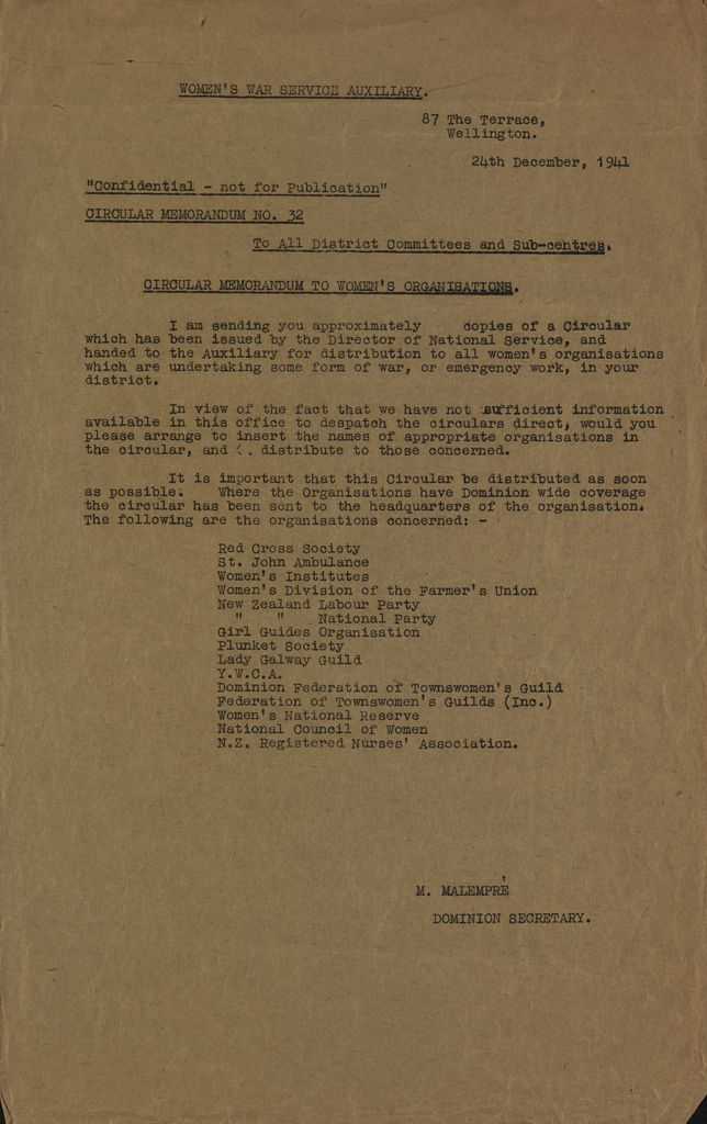 Memo marked "Confidential" entitled circular Memorandum t Women's Organisations. Dated 24 December 1941.