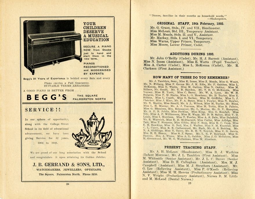 College Street School was established in 1893. Although it achieved its 50th anniversary in 1943, its jubilee celebrations were postponed until March 1946.