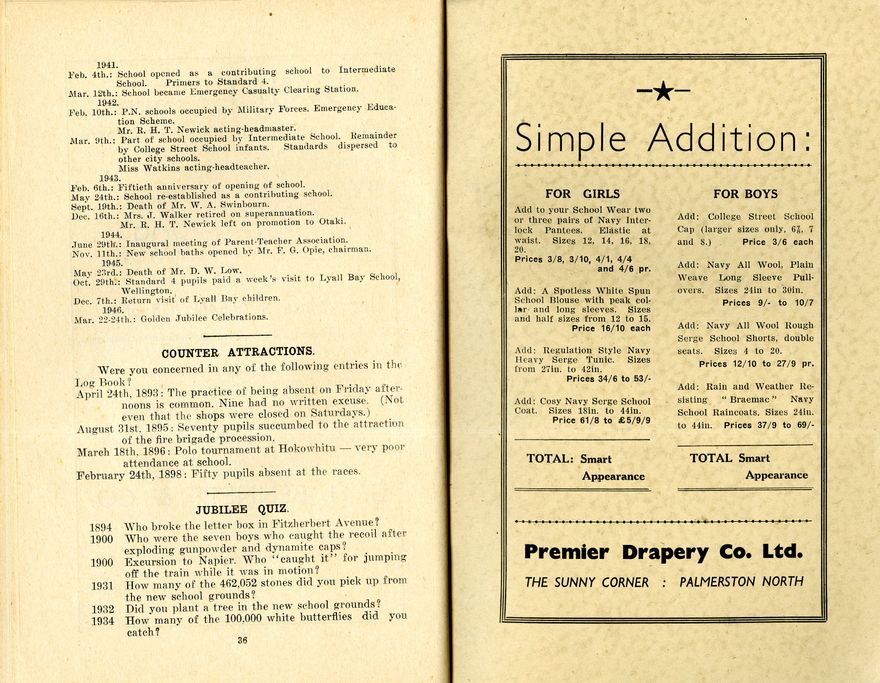 College Street School was established in 1893. Although it achieved its 50th anniversary in 1943, its jubilee celebrations were postponed until March 1946.