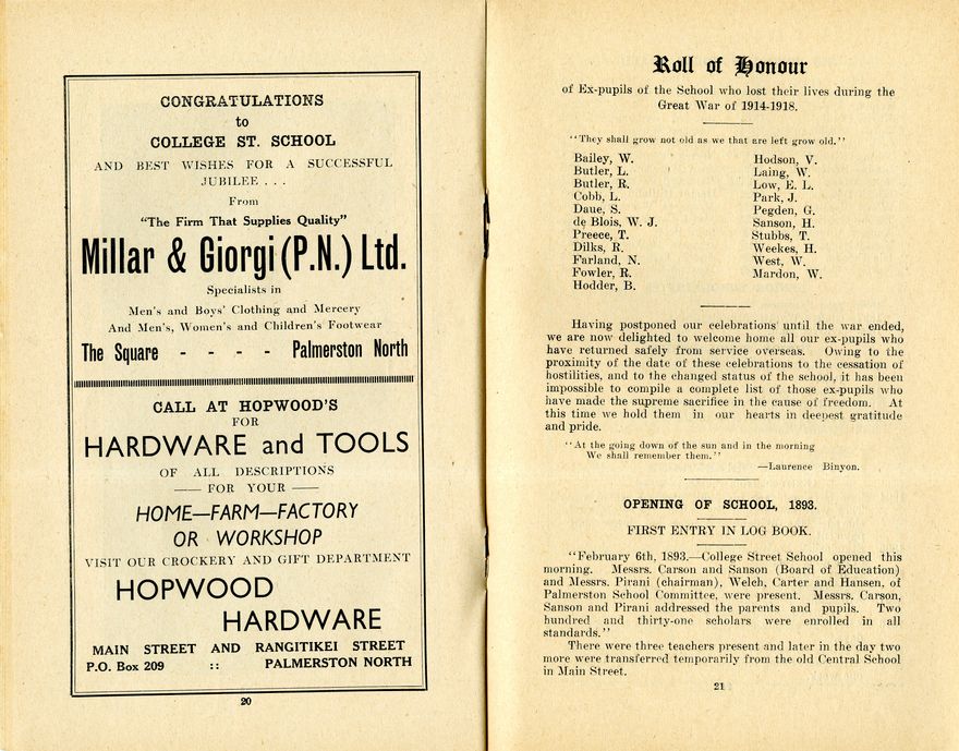 College Street School was established in 1893. Although it achieved its 50th anniversary in 1943, its jubilee celebrations were postponed until March 1946.