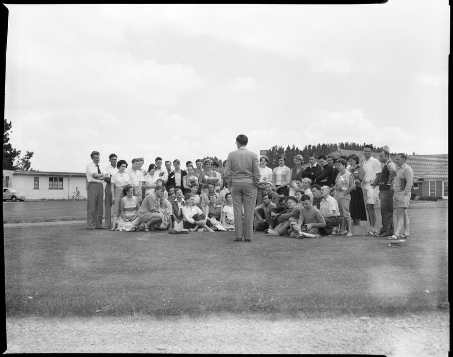 This image was taken for a story that ran in The Manawatu Evening Standard on 15 January 1958, page 8: "Mr. Richard Campion, director of the ninth annual residential theatre school at Massey College, is shown speaking to the students who are attending the school for the next eight days."