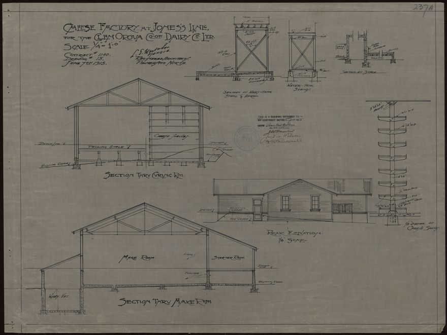 These plans for a cheese factory were designed by L. G. West and Son for the Glen Oroua Co-operative Dairy Company Limited. This company was established in 1900. The Danish-born architect Ludolph Georg West (1846-1919) established an architectural practice in Palmerston North in about 1880. In 1912 he formed a partnership with his son, Ernest Vilhem West, who continued the business after his father's death.