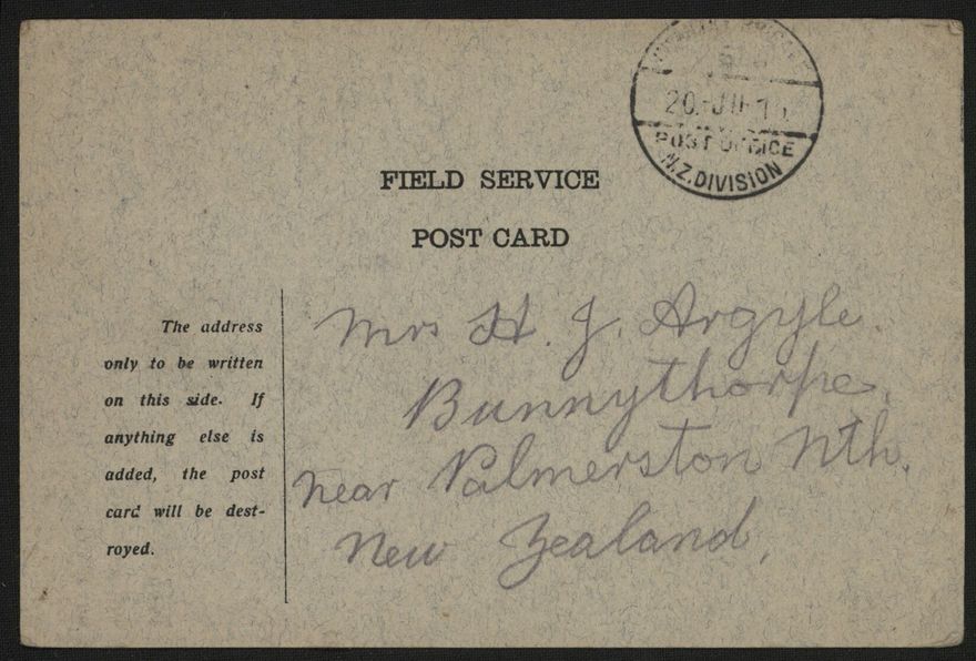 Postcard sent to Hector Argyle of Bunnythorpe, from his brother Len who was serving overseas in World War One. Nothing personal was written on these postcards, except for a name and date.