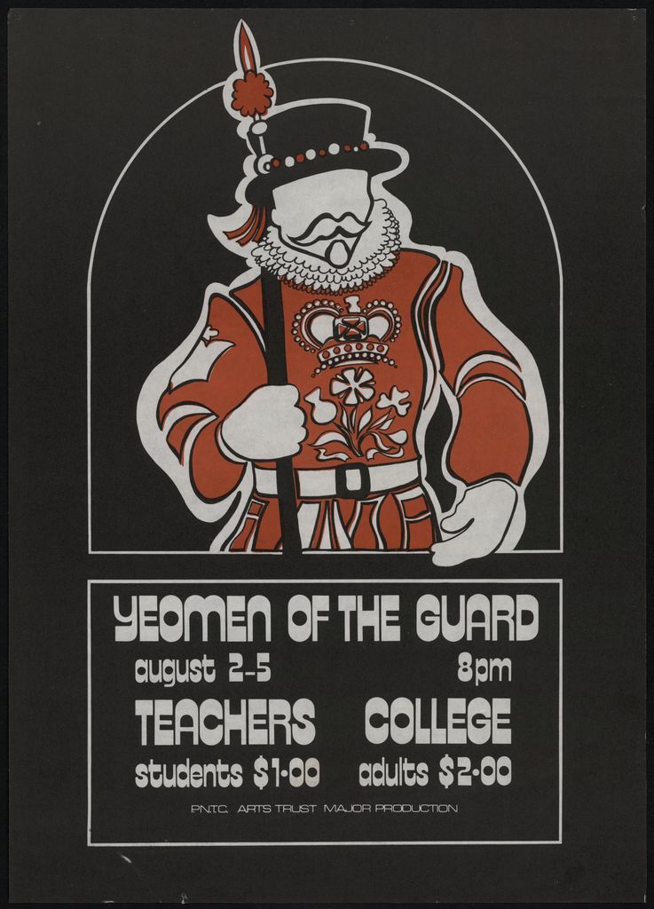Poster advertising the musical production of 'The Yeoman of the Guard'. It was billed as a Palmerston North Teachers College Arts Trust major production, and was held at the Teachers College, at 8pm, 2 - 5 August. Part of a collection of posters that were displayed in the Public Library in the 1970s - 1980s.