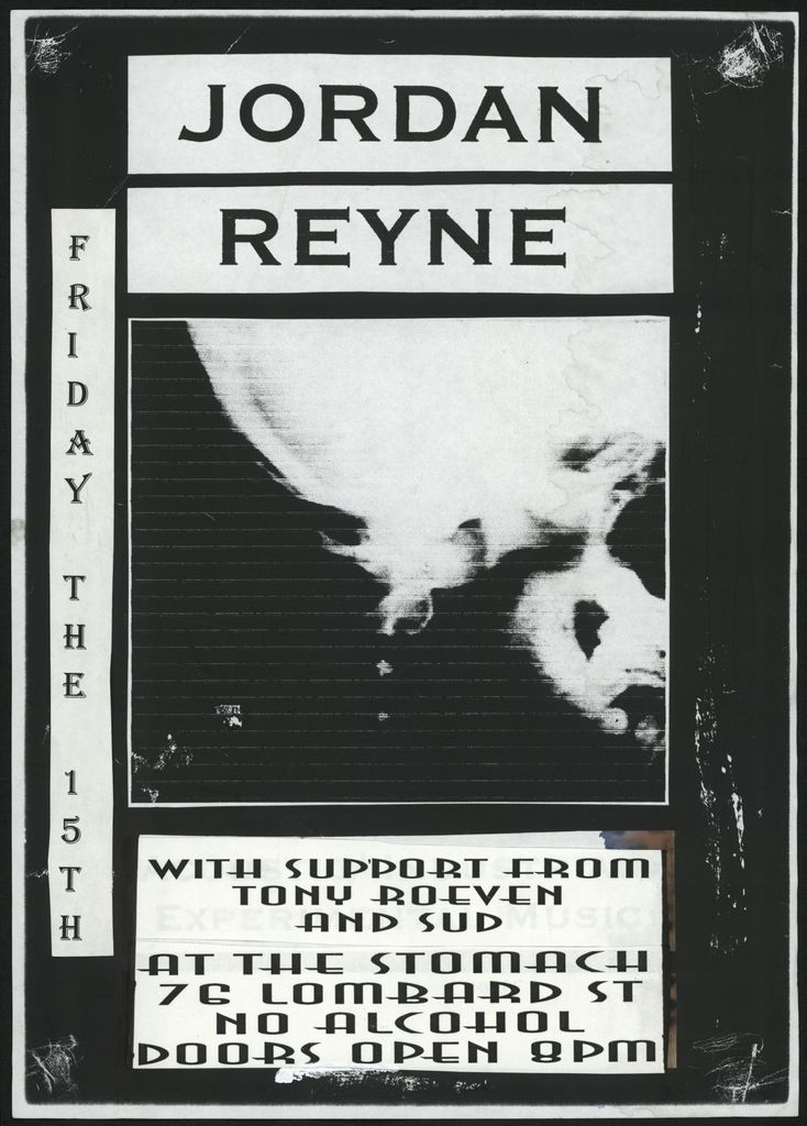 Part of a collection of posters that were displayed at The Stomach, Lombard Street, venue for Creative Sounds Society Incorporated.