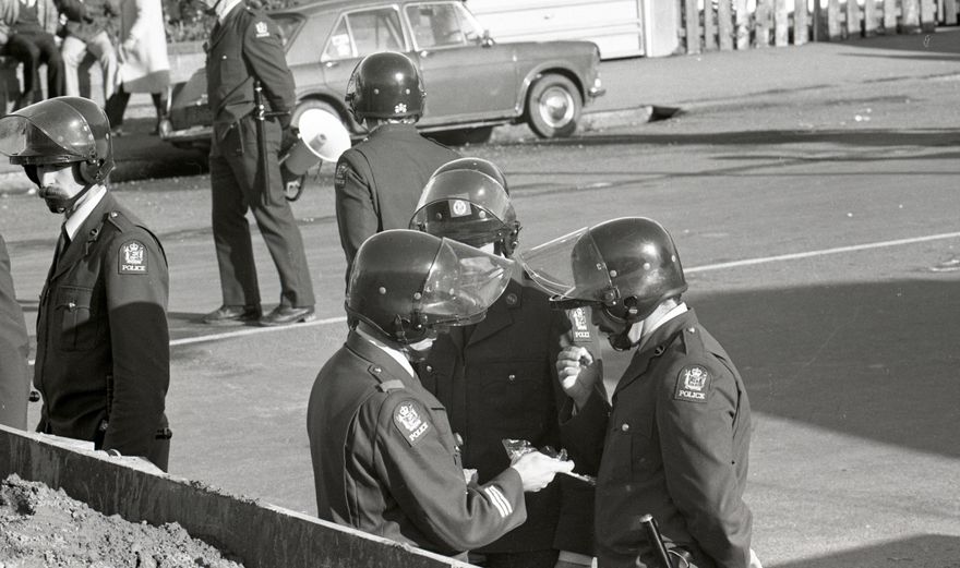 This image was taken (but not used) for a story that ran in The Manawatu Evening Standard on 01 August 1981. The Standard reported that as many as 1000 police were involved in planning for protests on game day, including the specially formed ‘Red and ‘Blue’’ riot squads.