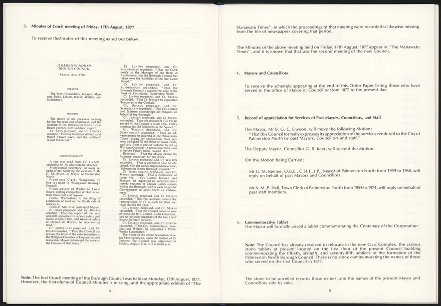Notice and Order Paper for Special Council Meeting to Commemorate 100 Years of Municipal Local Government in Palmerston North. Included are the meeting minutes from an early council meeting (17 August, 1877), and a listing of Mayors and Councillors from August 1877-August 1977.