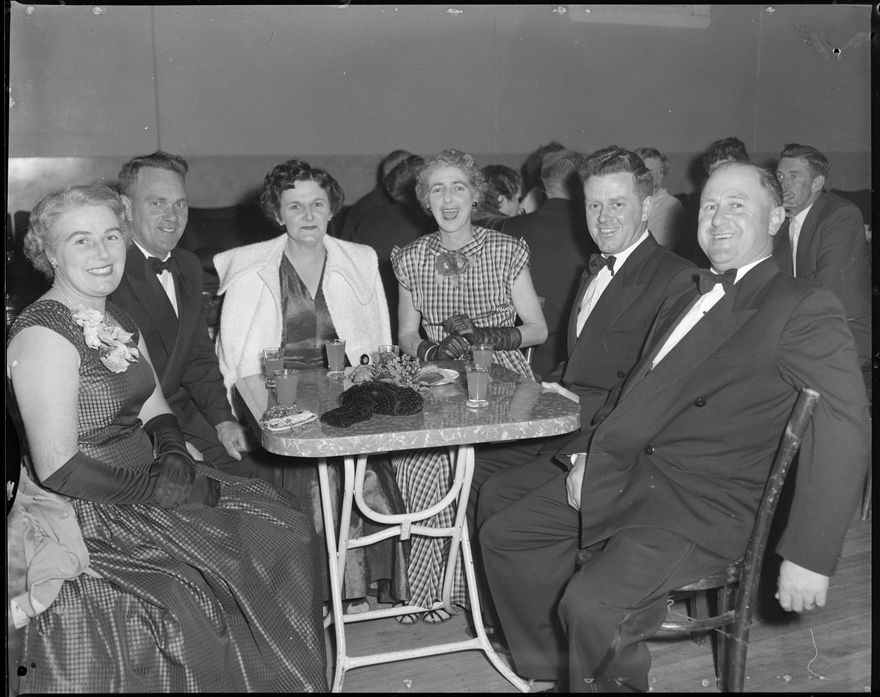This image was taken for a story that ran in The Manawatu Evening Standard on 30 May, 1959. "Members of the Returned Services Association at the R.S.A Ball last evening in the Astoria Ballroom. From left to right: Mrs A. Robson, Mr J. Gibbs, Mrs J. Gibbs, Mrs I. Dunford, Mr A. Robson and Mr I. Dunford."
