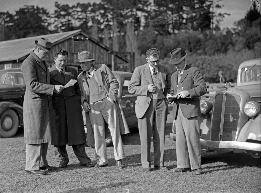 This photograph shows five unidentified men discussing matters in a parking lot.