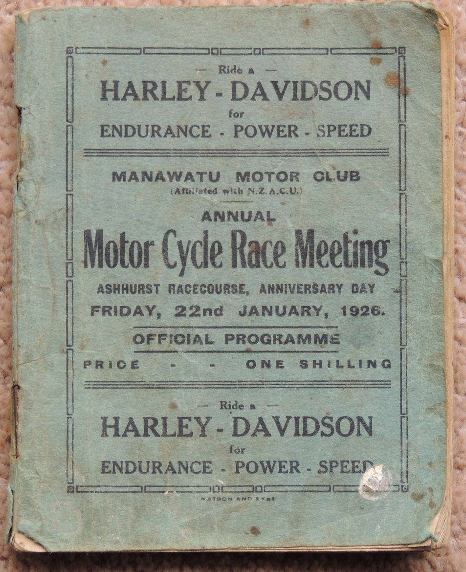 Motorcycle racing programme for the meeting at the Ashhurst racecourse, 22nd January, 1926.
