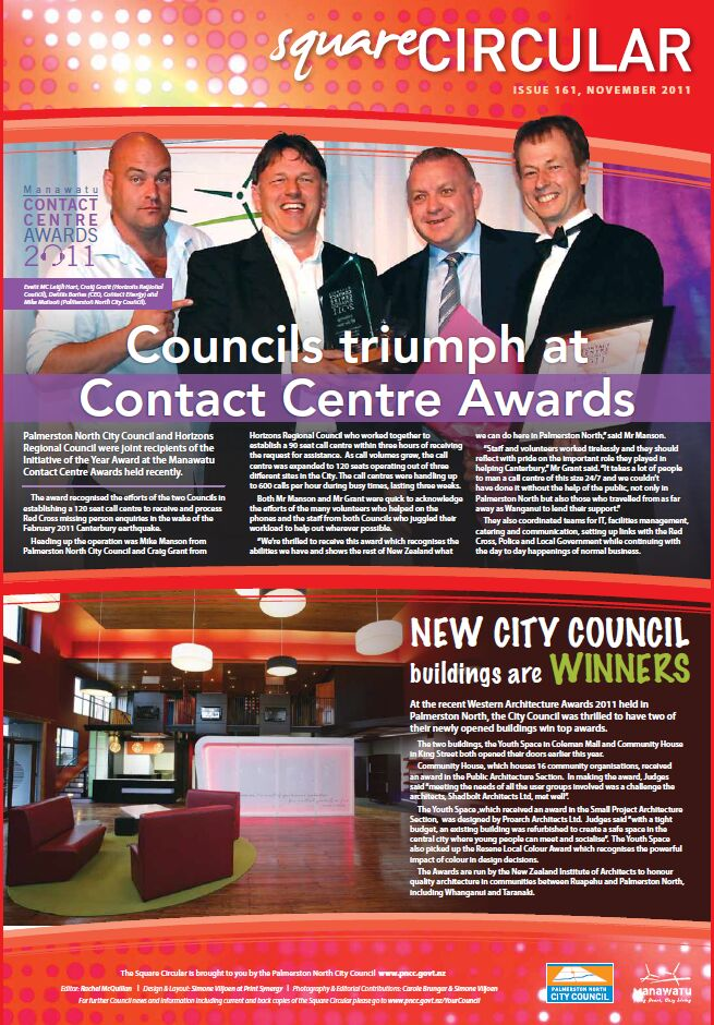 The Square Circular was Palmerston North City Council's monthly community publication, informing Palmerstonians of PNCC initiatives, activites, and events. This month's issue includes: Sustainability; Water Safety; Food Safety; Population; Civil defence; Contact Centre Awards; Western Architecture Awards; Council Internships; Jaycee Trust; Library.