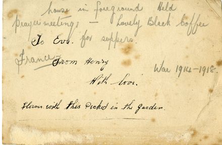A postcard featuring a hand-drawn sketch of a village in France surrounded by trees. It was written by Henry Ward, who served with the New Zealand Medical Corps, No. 3 Field Ambulance, from March 1917 to March 1919, to Eva Eastwood, who he married in June 1919. The message reads: "To Eva