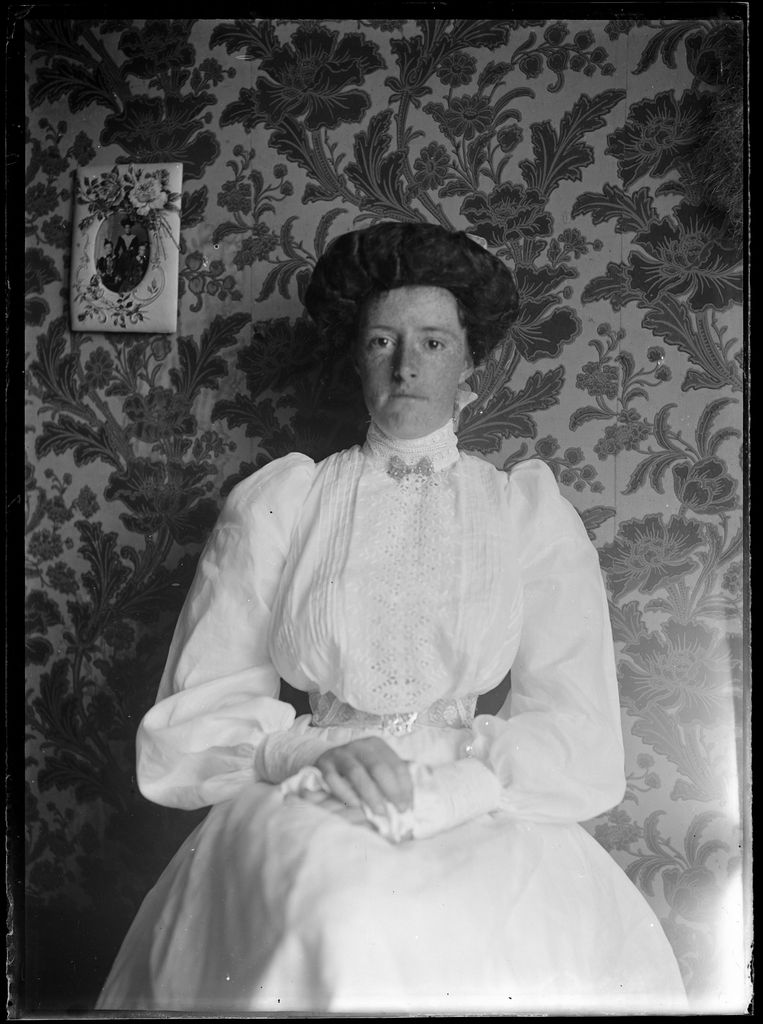 This photograph was created by William James Young in the early 20th century. The same unidentified woman (and distinctive wallpaper) appears in several other photographs, including: 2015G_Young27_010159; 2015G_Young110_010229; 2015G_Young164_010276.