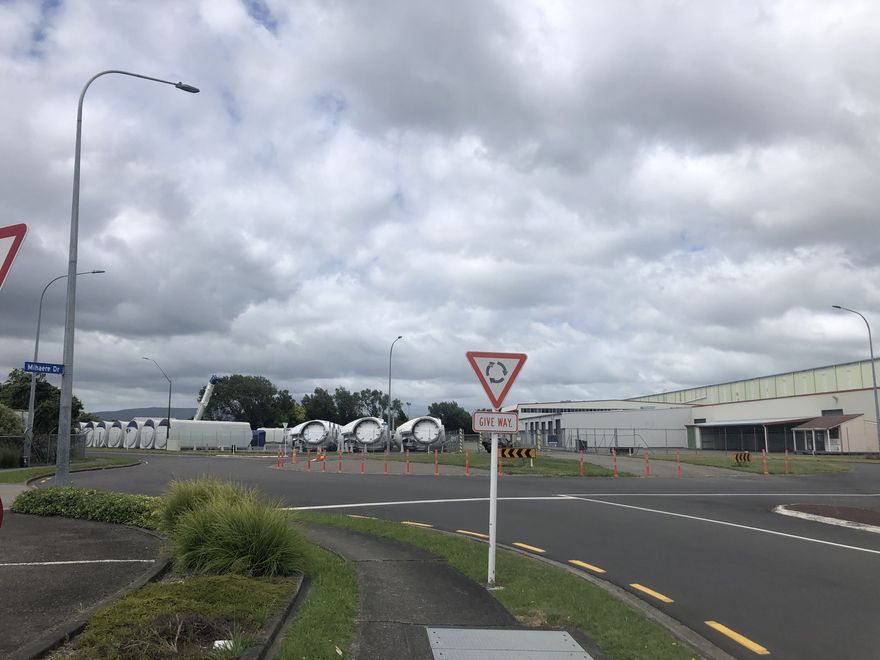 Wind farm parts in storage near the Keith Street power station awaiting transportation to Mercury's Turitea wind farm on the Tararua Range.