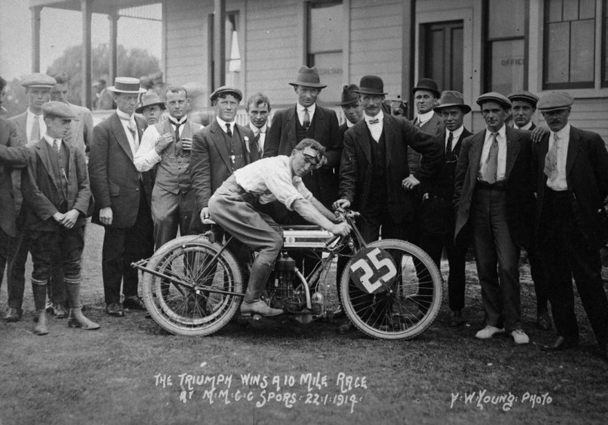 Members of the Manawatu Motor Cycle Club [MMCC] of Palmerston North shown with the 10 mile race winner, Alex Anderson. Anderson raced with considerable success around the lower North Island from 1913-1918. This race was held at the Tauherenikau Racecourse, Wairarapa, where Anderson entered and won both the 5 1/2 and 10 mile events. Third from right, with white shoes, is Harry Anderson. The photograph has the caption, "The Triumph wins a 10 mile race at MMCC Sports 22 1 1914. For an account of the race, see Manawatu Times, Volume LXV, Issue 2135, 23 January 1914, Page 5 (Available online at paperspast.natlib.govt.nz) Harold Plimmer was killed in an accident at the event.