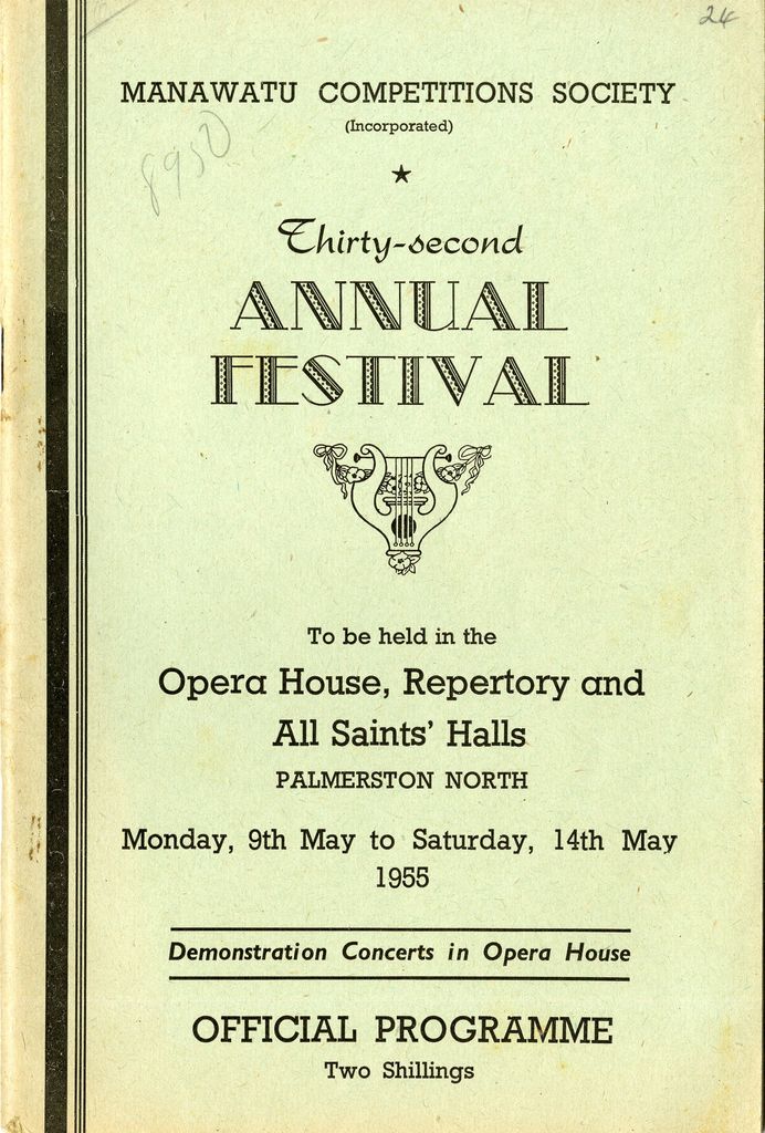 This is the programme for the Thirty-Second Annual Festival of the Manawatū Competitions Society, which was held in the Opera House, Repertory and All Saints' Halls between 9 and 14 May 1955. The competition categories included elocution (speech and drama), dance and music (both vocal and instrumental). Most entrants were children or young people.