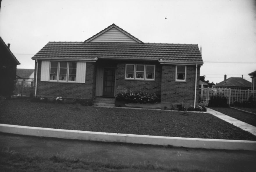 The donor's family moved into this house in Savage Crescent on Christmas Eve 1939. This photograph was taken about six months later, with fences and gardens established. Saavge Crescent was developed by the Government as state housing 1937-1944. It remains as an excellent example of early state housing in New Zealand.