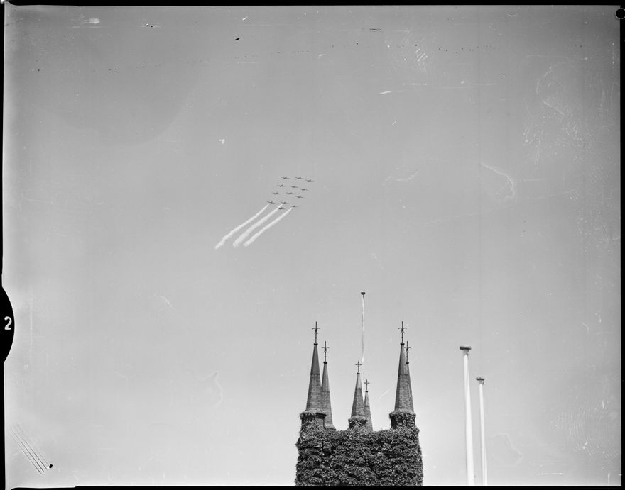 This image was taken (but not used) for a story that ran in The Manawatu Evening Standard on 26th January 1966 "Thirteen Harvard training planes of the R.N.Z.A.F. pass over the city on their way to Mangere Airport for the pageant this weekend."