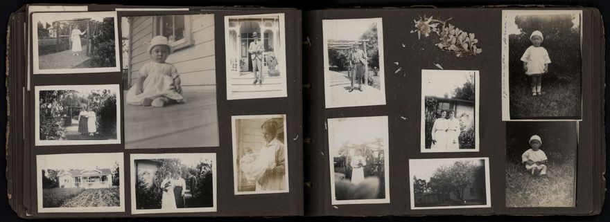 Album contains photos of the Dumbleton family, extended families and holidays in New Zealand and England. Most images not identified. Not in chronological order. The name Mina Dumbleton is handwritten inside the front cover.