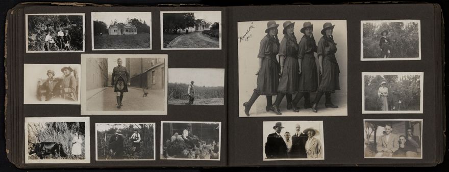 Album contains photos of the Dumbleton family, extended families and holidays in New Zealand and England. Most images not identified. Not in chronological order. The name Mina Dumbleton is handwritten inside the front cover.