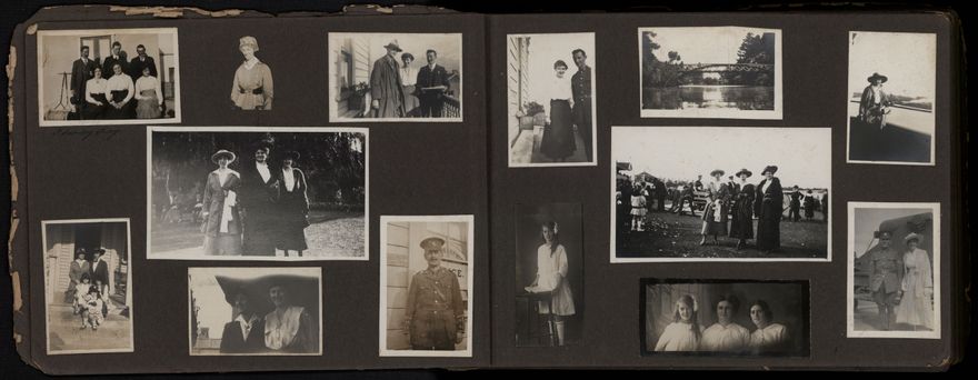 Album contains photos of the Dumbleton family, extended families and holidays in New Zealand and England. Most images not identified. Not in chronological order. The name Mina Dumbleton is handwritten inside the front cover.