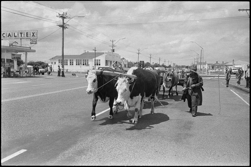"The bullock team, owned and trained by 74-year-old, Mr T. Aplin, Dannevirke. The team gave a display in the school grounds."