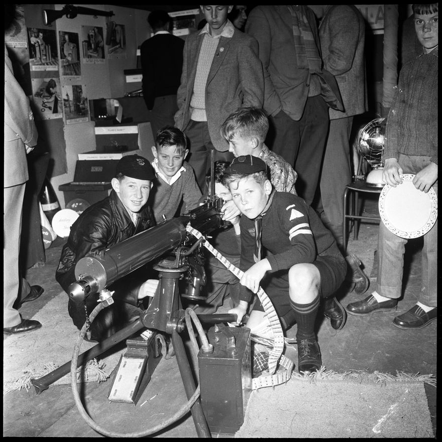 This image was taken for a story that ran in The Manawatu Evening Standard on 08 May 1961 "One of the most popular exhibits at the Industries Fair on Saturday afternoon was the Army display. Young people were able to handle much of the equipment. This group could not leave this machine gun alone."