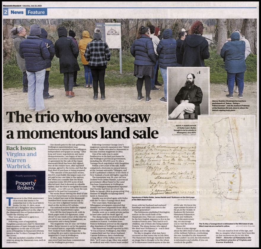 Local historians weekly "Back Issues" article in the Manawatū Standard. In July 1864, Rangitāne paramount chief Te Hirawanui Kaimokopuna of Ngāti Mutuahi was the lead signatory in the sale of 250,000 acres of Rangitāne ki Manawatū whenua, known as the Te Ahu a Turanga block, to the Crown. Years of negotiation had preceded the sale.