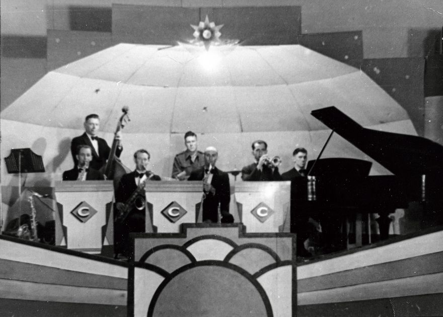 The Commandos Orchestra played at the Army, Navy and Airforce Dance Hall in George Street. They originally began as ‘The Revellers’ and ended as 'The Commanders'. Pictured are Peter Jordan (on piano), Norman Jordan (bass), Alan Jordan (drums) Athal Donaldson (trumpet) Henry Prince (1st alto saxophone), ? Flowers(1st tenor saxophone), Flowers, Arthur Burt (2nd alto and tenor).