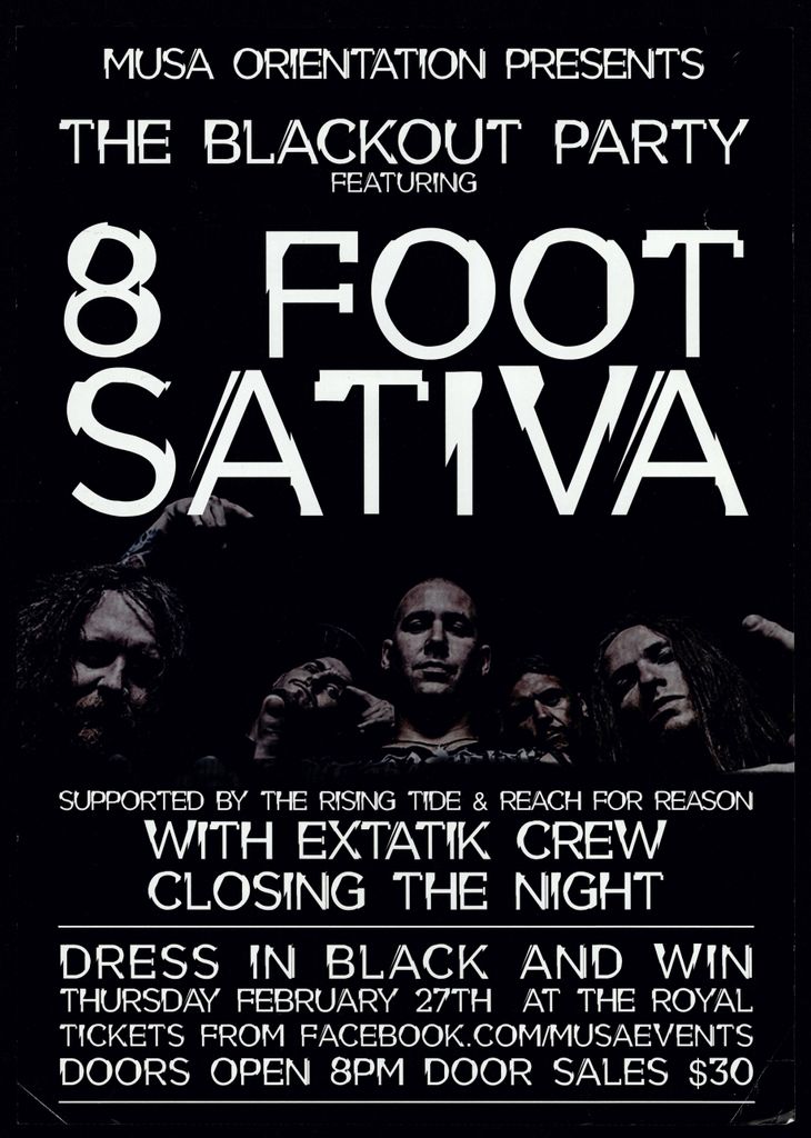 MUSA orientation presents The Blackout Party. Featuring 8 Foot Sativa. Supported by The Rising Tide & Reach for Reason. With Extatik Crew closing the night. Dress in black and win. Thursday 27th at The Royal. Tickets from facebook.com/MUSA events. Doors open 8pm. Door sales $30. Part of a collection of posters that were displayed at The Stomach, Lombard Street, venue for Creative Sounds Society Incorporated.