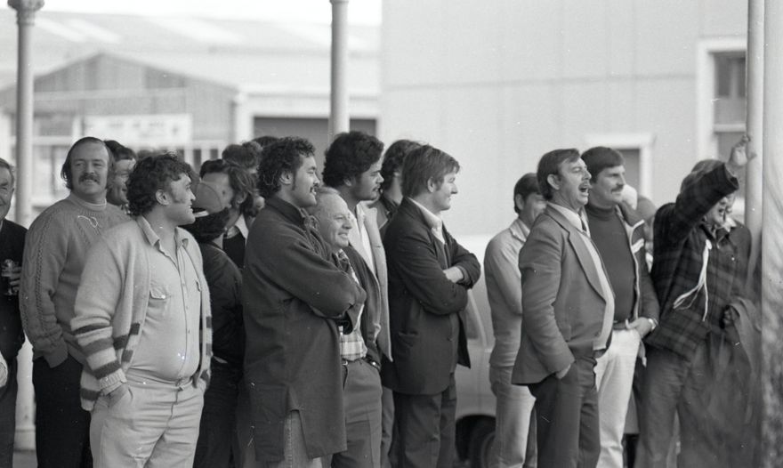 This image was taken for a story that ran in The Manawatu Evening Standard on 01 August 1981, with the caption: "Rugby fans watch the protesters.” The Standard reported “About 50 people from inside the Carlton Hotel came out on the street and heckled the marchers, but the exchanges were mostly good humoured.”
