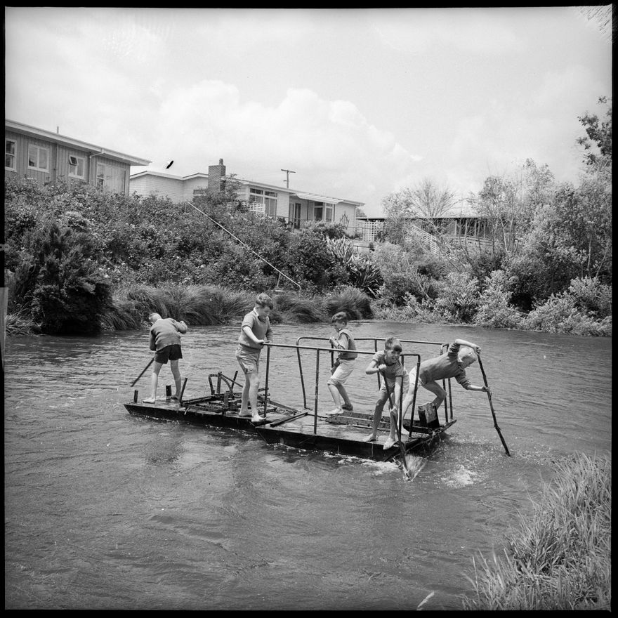 This image was taken for a story that ran in The Manawatu Evening Standard on 4 January, 1964. "There is nothing better than playing in boats, even if you do run the risk of getting your feet wet. These boys certainly had fun punting about on a pontoon at Centennial Lake. However, the "crew" found the going against the wind too hard and finished up berthed against the bank."