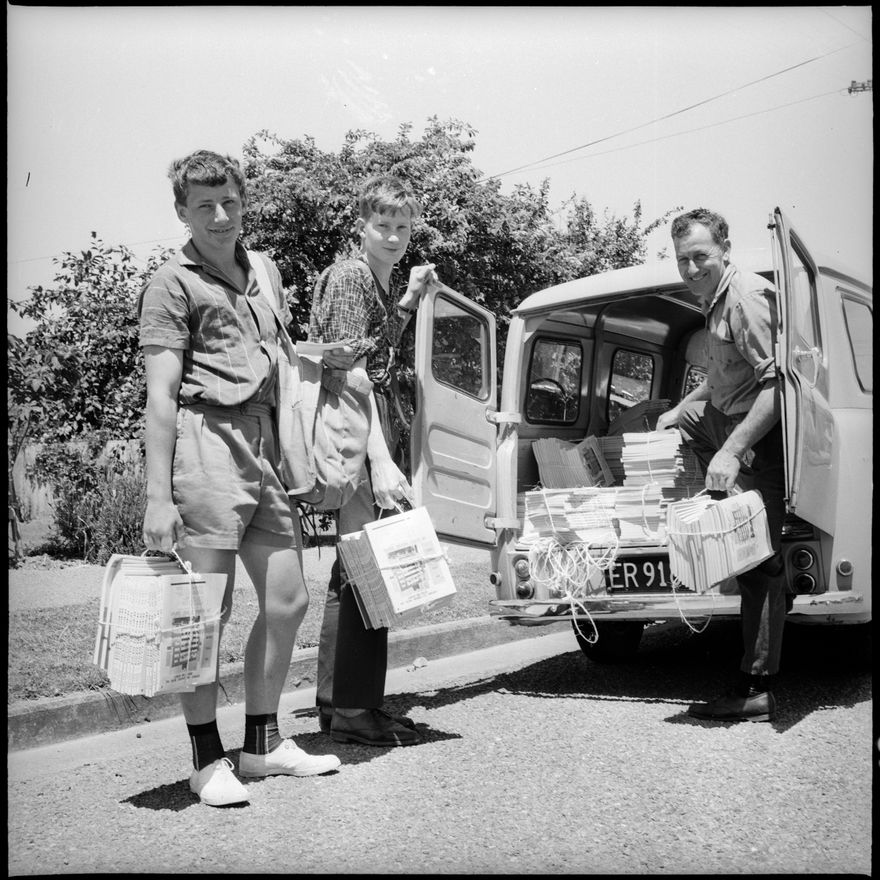 This image was taken for a story that ran in The Manawatu Evening Standard on 13th December 1965 "To earn [obscured] for Christmas, a number of secondary school students have taken jobs for part of the holidays. These two lads are seen helping Mr., J. Lyons, of the Post Office, in delivering new telephone directories in the Terrace End area. On the left is C. Hunt and B. Davenport of Queen Elizabeth Technical College. Other boys are helping in other parts of the city."